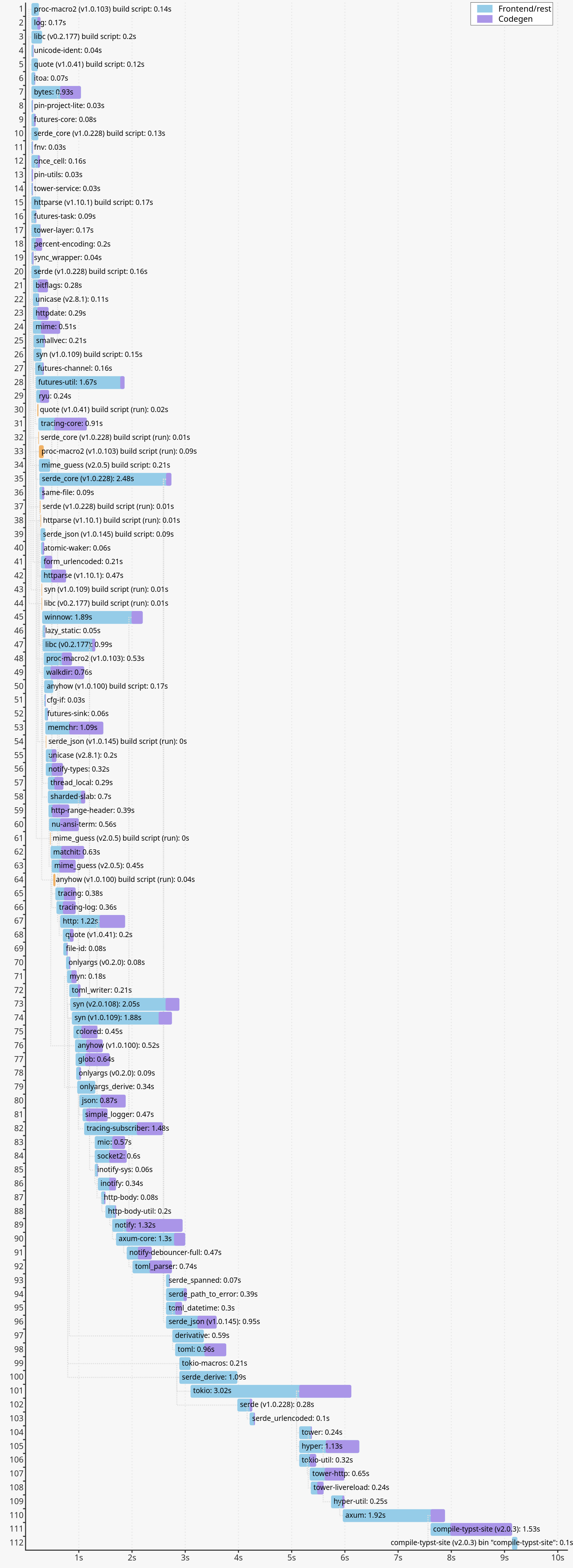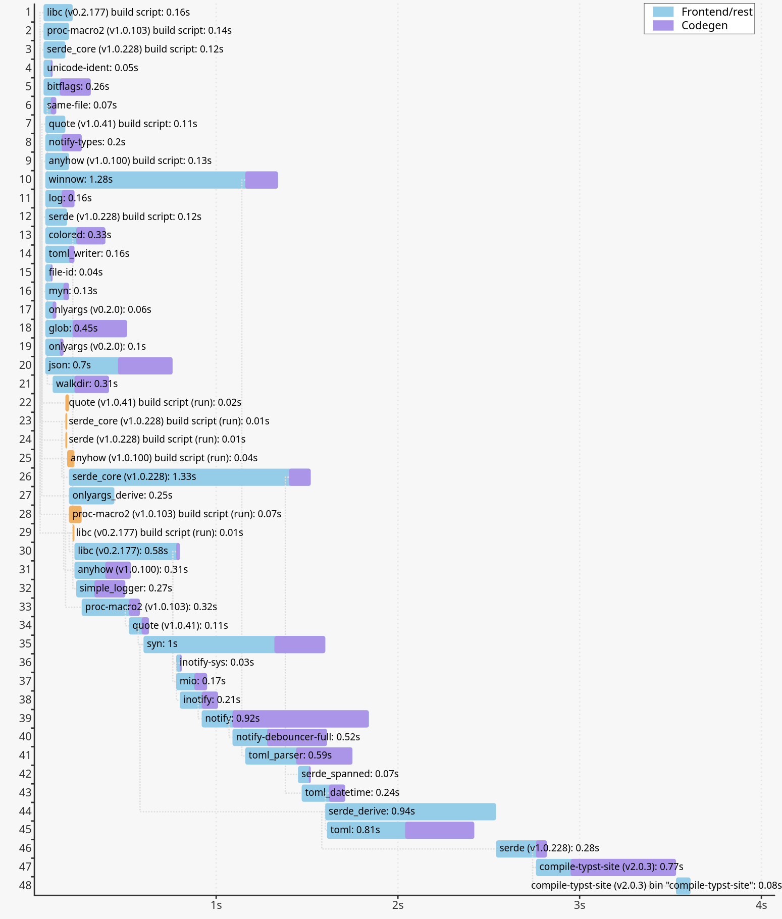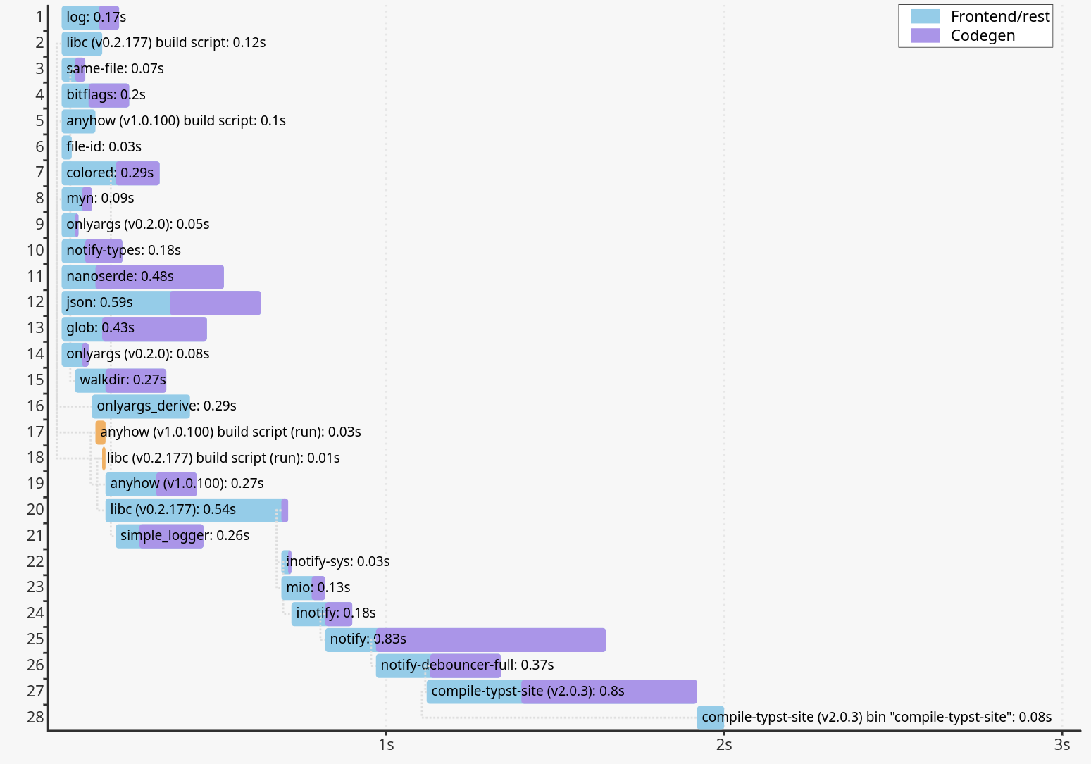 It was pretty cool! But compiling instantly became heavier. Rust lets you profile with the --timings build flag, so let’s see how that looks: